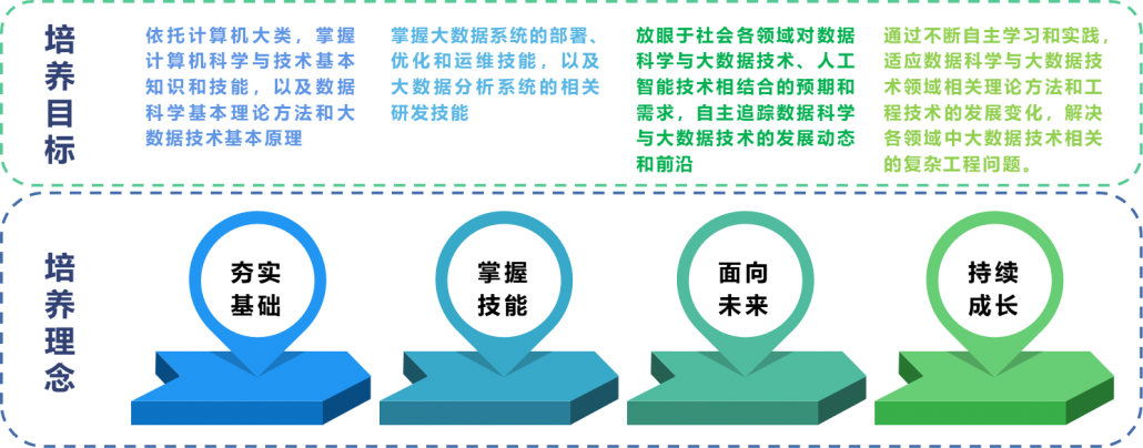 本專業(yè)立足于計(jì)算機(jī)科學(xué)與技術(shù),面向數(shù)據(jù)科學(xué)與大數(shù)據(jù)技術(shù)領(lǐng)域涉及的數(shù)據(jù)采集、數(shù)據(jù)存儲(chǔ)、數(shù)據(jù)分析、數(shù)據(jù)展示,培養(yǎng)能夠解決大數(shù)據(jù)分析系統(tǒng)相關(guān)的部署、優(yōu)化、運(yùn)維、研發(fā)等復(fù)雜工程實(shí)踐問題的數(shù)據(jù)工程師。同時(shí)通過課程設(shè)置,保留向人工智能技術(shù)進(jìn)一步拓展的接口,以及向計(jì)算機(jī)科學(xué)與技術(shù)專業(yè)進(jìn)一步深造的通道。